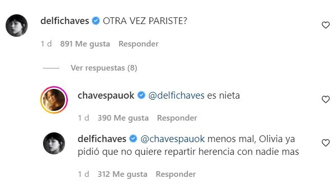 "Esta banda", escribió Paula, a lo que su hermana menor le preguntó, en mayúsculas: "¿Otra vez pariste?". "Es nieta", le contestó, y Delfina remató: "Menos mal, Olivia ya pidió que no quiere repartir la herencia con nadie más".