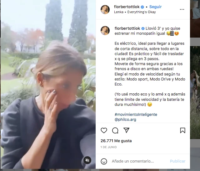 Las precipitaciones parecieron complicarle la actividad, pero Bertotti explicó en su video: “Llovió tres minutos y yo quería estrenar igual mi monopatín”. Así que a pesar del clima adverso para salir a la intemperie, Florencia cumplió con su deseo y salió a recorrer las calles montada a su nueva adquisición.