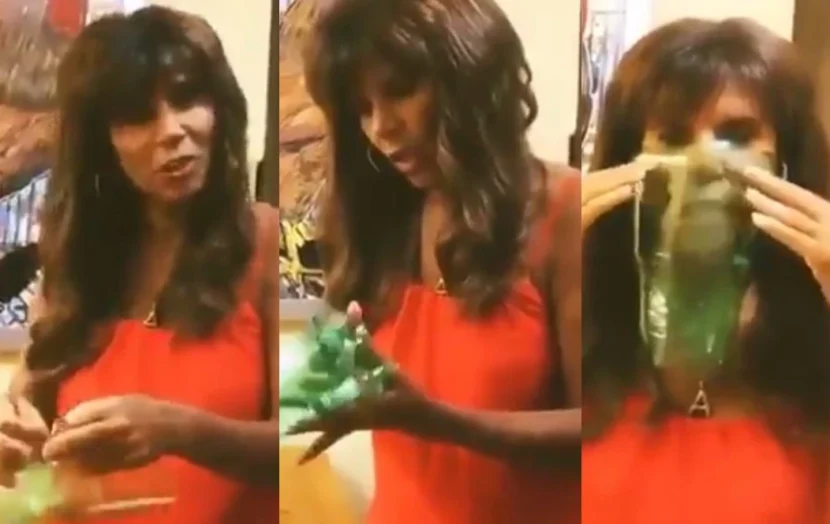 Porque la exmodelo compartió un divertido video donde muestra el procedimiento para hacerse una mascarilla con una botella de plástico de gaseosa. “Hoy te enseño a crear un tapabocas con una botella de gaseosa Rica, ecológica y elegante”, publicó Anamá en Twitter, para presentar su sintético clip de un minuto.