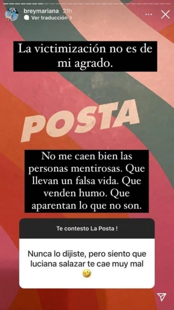 A la hora de responder sobre Luciana lo dijo todo. Bajo el lema “te contesto la posta”, un “seguidor” le consultó: “Nunca lo dijiste pero siento que Luciana Salazar te cae muy mal”, y acompañó la pregunta con un emoji riendo. Y la respuesta de Brey fue “cruda”, al nivel de la “pregunta”. Primero, Mariana arrancó enfatizando que “la victimización no es de mi agradado”. “Posta”, continúo su respuesta.