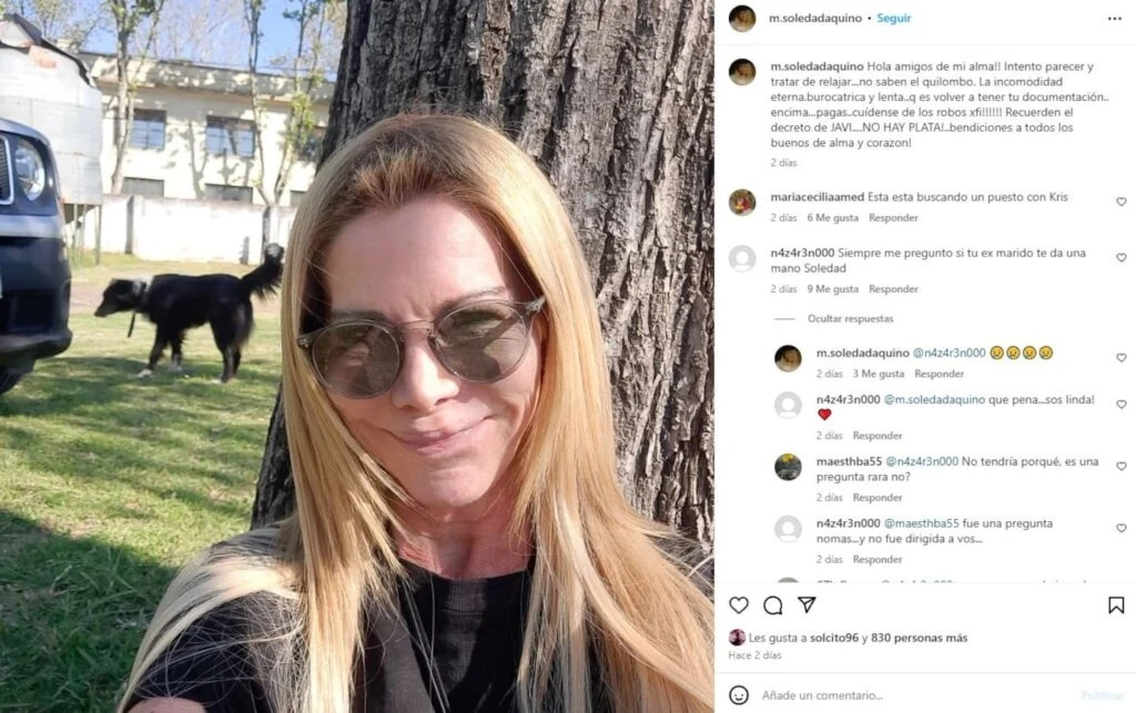En la publicación, uno de sus seguidores le consultó si su ex esposo, Marcelo Tinelli, la ayudaba con dinero o con cualquier otra cosa. La respuesta de Soledad fue letal. Si bien no dijo nada con palabras, sí lo expresó con emojis de caritas tristes.
