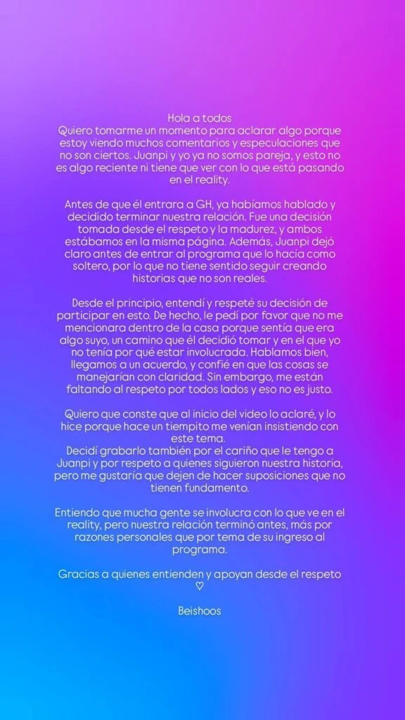 “Fue una decisión tomada con respeto y madurez, y ambos estábamos en la misma página. Además, Juanpi dejó en claro antes de ingresar al programa que lo hacía como soltero, por lo que no tiene sentido seguir creando historias que no son reales”, agregó la mujer, exponiendo que realmente ella ya no tiene nada que ver con el jugador de GH.