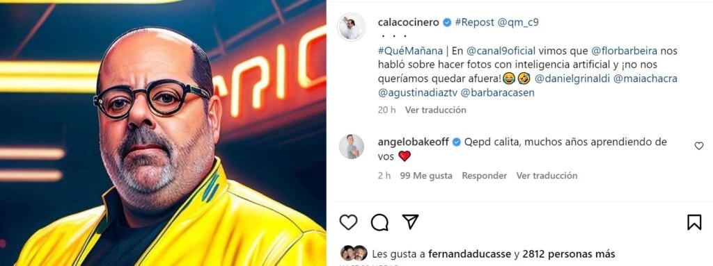 ¿Qué hizo el chef? Compartió un posteo de Canal 9, donde todos los días desde 2023 conducía Qué mañana. “En @canal9oficial vimos que @florbarbeira nos habló sobre hacer fotos con inteligencia artificial y ¡no nos queríamos quedar afuera!”, reposteó Cala.
