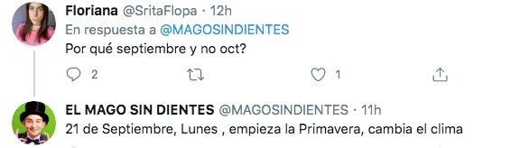 "21 de septiembre, lunes, cambia el clima" le respondió a otra seguidora que quiso saber un poco más de lo que sucederá en el futuro. Otros, en cambio, se lo tomaron en broma. "¿Pero quien sos, Nostradamus?" le preguntó alguien. Y un último sentenció "tenés que ser mago para llegar vivo a esa fecha".
