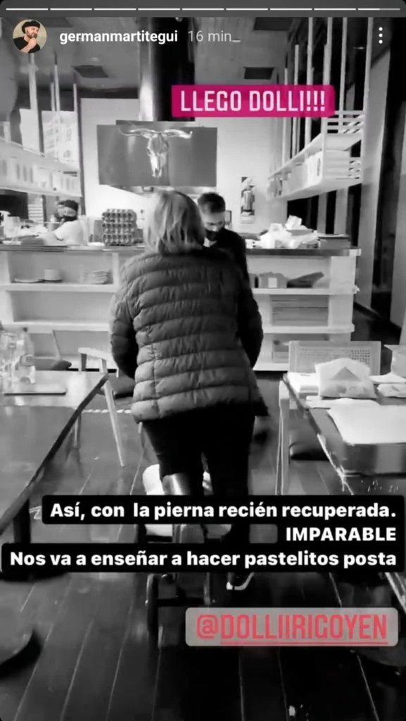 Con una storie, Martitegui reveló: "¡Llegó Dolli! Así con la pierna recién recuperada. Imparable. Nos va a enseñar a hacer pastelitos posta". Claro que así demostró que la chef posee una bota ortopédica en su pierna izquierda y que utiliza un carrito para trasladarse.