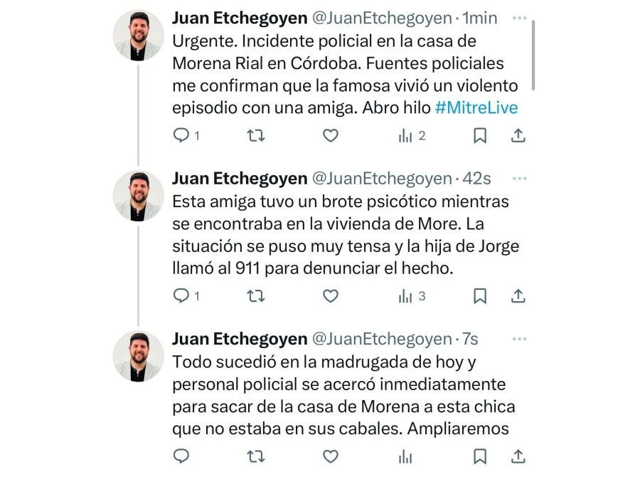 "Incidente policial en la casa de Morena Rial en Córdoba. Fuentes policiales me confirman que la famosa vivió un violento episodio con una amiga", comenzó diciendo Etchegoyen, quien tuvo contacto directo con las autoridades policiales.
