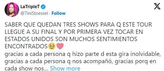 Tini Stoessel está a punto de cerrar su gira "Tini Tour" con tres shows en Estados Unidos. La cantante, que ya visitó varios países y llenó estadios, compartió un sentido mensaje en las redes sociales, donde agradeció a su público y a su familia por el apoyo.