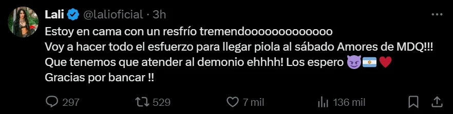 "Estoy en cama con un resfrío tremendooooooooooooo Voy a hacer todo el esfuerzo para llegar piola al sábado Amores de MDQ!!! Que tenemos que atender al demonio ehhhh! Los espero. Gracias por bancar!!", escribió Lali en sus redes sociales.