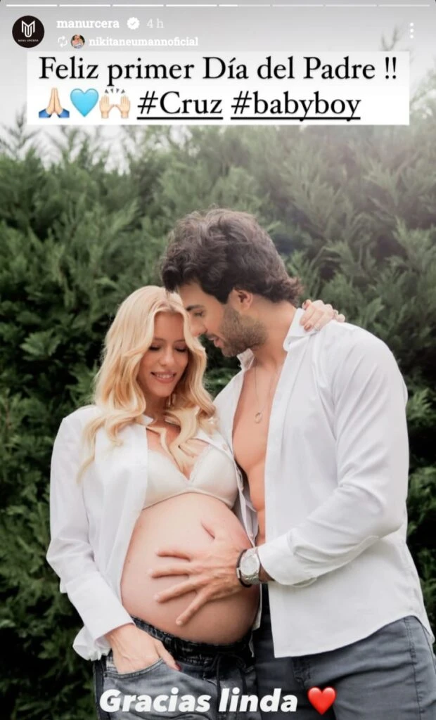 En la previa a ser padres, Nicole Neumann le dedicó también un mensaje a José Manuel Urcera que está viviendo su primer día del padre. En la foto salen ambos y el piloto de carrera acariciando la panza de la modelo. La foto fue acompañada por el texto "Feliz primer Día del Padre". Él reposteó la historia y expresó "Gracias Linda", junto a un corazón.