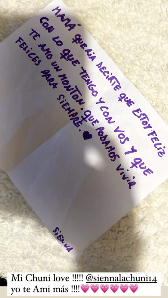 Luego agregó: "Estoy feliz con lo que tengo y con vos y que te amo un montón. Que podamos vivir felices para siempre. Sienna", termina el tierno mensaje que le dedicó su hija más pequeña.