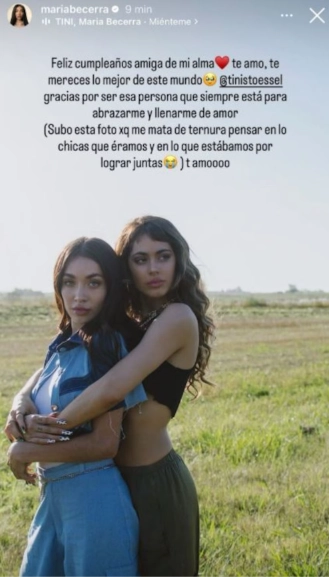 “Feliz cumpleaños amiga de mi alma, te amo. Te merecés lo mejor de este mundo Tini, gracias por ser esa persona que siempre está para abrazarme y llenarme de amor”, comenzó escribiendo María. También explicó por qué eligió dicha foto para saludarla: “Subo esta foto porque me mata de ternura pensar en lo chicas que éramos y en lo que estábamos por lograr juntas, te amo”.