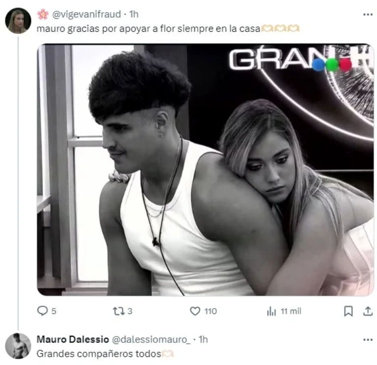 Luego, una cuenta de fanáticos de Florencia Regidor le comentó: "Mauro, gracias por apoyar a Florencia siempre en la casa". El ex rugbier no dudó en contestar el mensaje de una usuaria de Twitter. "Grandes compañeros todos", le respondió.