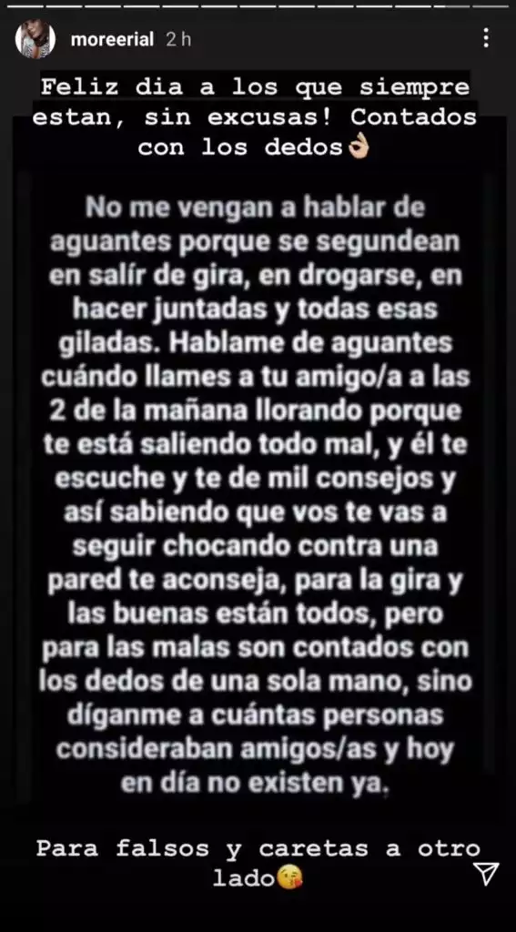 En la continuidad de las líneas de More se ve: “Hablame de aguantes cuando llames a tu amigo a las dos de la mañana llorando porque te está saliendo todo mal, y él te escuche y te de mil consejos y así sabiendo que vos te vas a seguir chocando contra una pared te aconseja”.