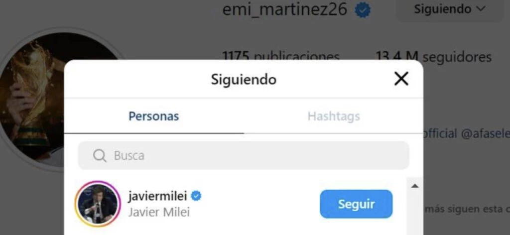 El Dibu Martinez, que es uno de los arqueros más queridos del mundo y que tomó mucho protagonismo en los últimos años dentro de la Selección decidió comenzar a seguir al economista quien asumirá el próximo domingo 10 de diciembre.