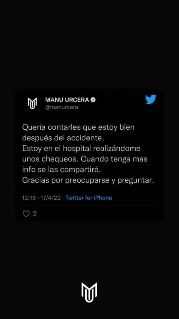 Afortunadamente, Manu se encuentra fuera de peligro, tras chocar contra el paredón de la pista principal, por lo que fue atendido de forma inmediata y le diagnosticaron una distención de ligamento de la rodilla izquierda; después fue trasladado a un centro médico para realizarse chequeos a través de imágenes.