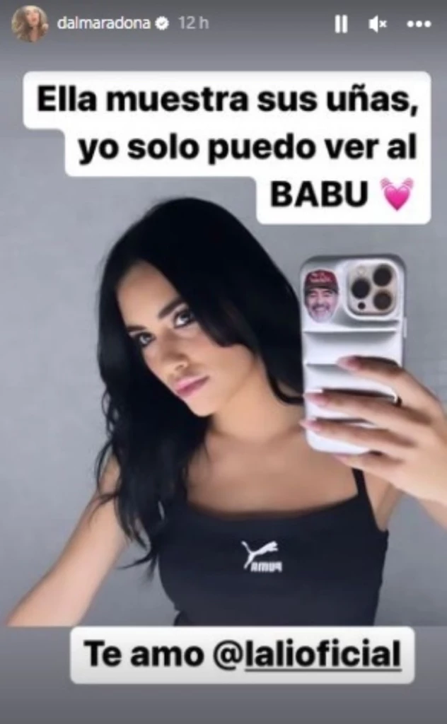 Fue entonces que en la foto se la ve a Lali con su celular y tiene una foto de Diego Maradona. Súper emocionada, Dalma destacó el detalle y escribió: “Ella muestra sus uñas, yo sólo puedo ver al Babu. Te amo Lali".