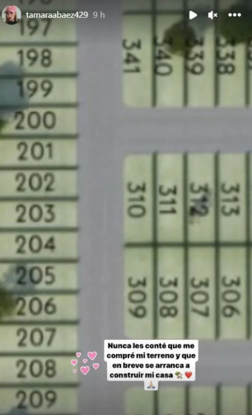 "Nunca les conté… Me compré mi terreno… En breve, se arranca a construir mi casa", escribió Báez en sus historias de Instagram donde mostró un diagrama con el loteo del barrio donde levantará su nuevo hogar en muy poco tiempo.