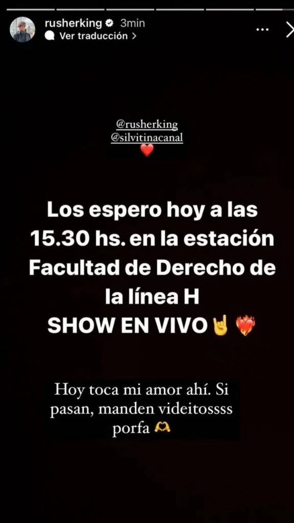 Hace algunas horas fue el ex de María Becerra quien dio un gran anuncio mediante su cuenta de Instagram que daría un show gratuito en el subte al igual que Sebastián Yatra: "Los espero hoy a las 15,30 hs en la estación Facultad de Derecho de la línea H. Show en vivo".