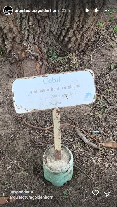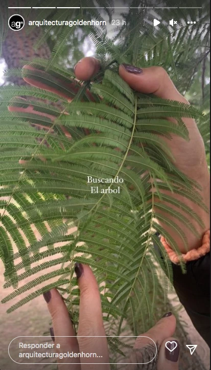 "Buscando el árbol", se lee en una foto donde se pueden ver las manos de Juana sosteniendo una hoja de una planta. La pareja parece haber visitado un vivero en búsqueda de una especie, ya que después el arquitecto mostró las fotos de otros árboles que seguramente llamaron su atención, como el cebil, cuyo cartel identificatorio mostró en una foto.