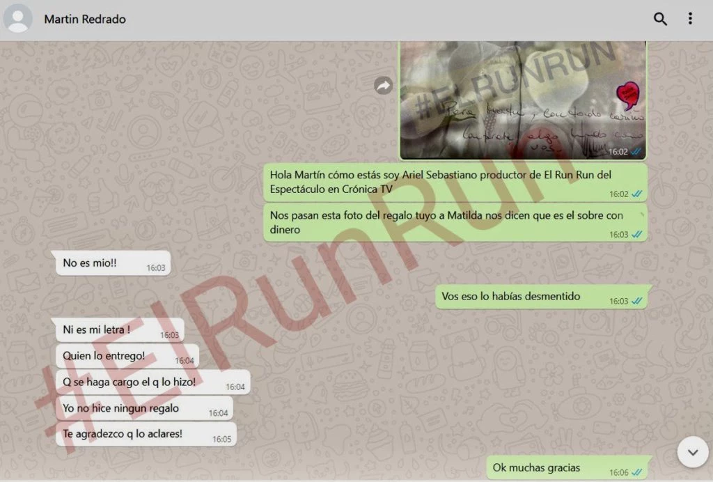 Pecoraro mostró además el chat de Redrado con uno de sus productores del programa de Crónica TV. “Nos pasan esta foto del regalo tuyo a Matilda. Nos dicen que es el sobre con dinero”, le preguntaron.