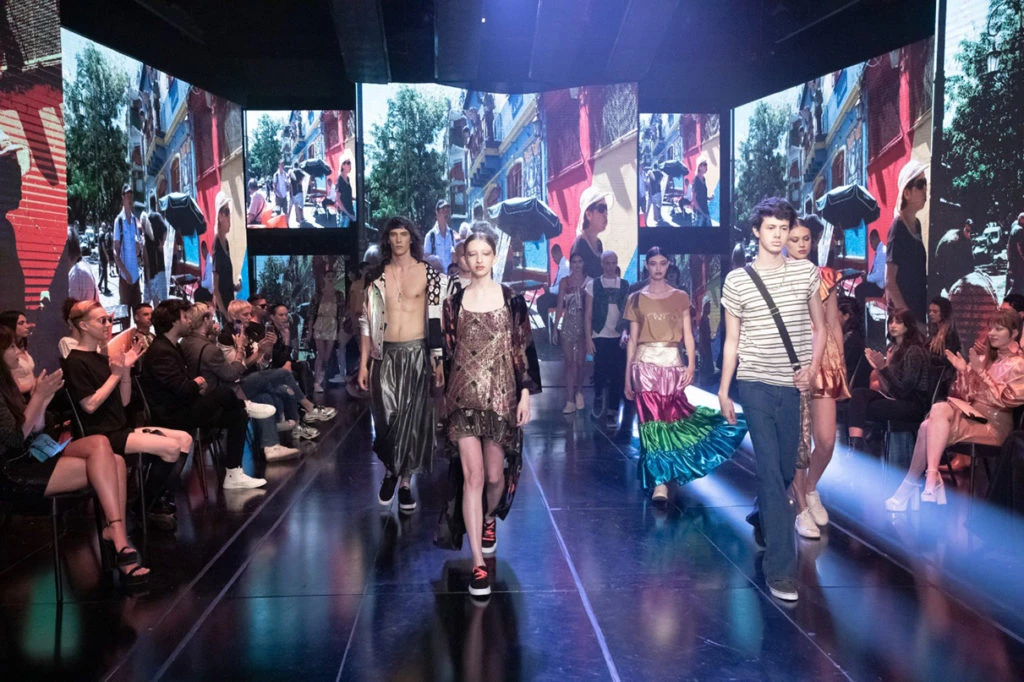 Dante modeló unos jeans unisex y una remera a rayas, modelo Ciboulette verde. Completó el equipo con un morral cruzado y zapatillas. La colección, creada por Lucas, fue denominada Cambalache y la rompió en el desfile.