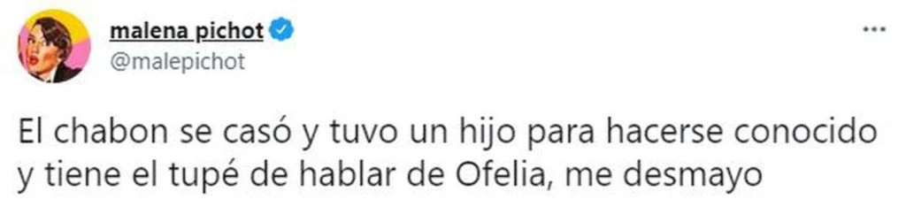 Fernández, por su parte, solo respondió en Twitter y con una chicana: “A mí al menos me conocen el nombre y apellido” reza el tweet publicado por la joven legisladora. Luego, recibió el apoyo de Malena Pichot, quien cuestionó las capacidades del marido de Pampita para ocupar una banca. “El chabón se casó y tuvo un hijo para hacerse conocido y tiene el tupé de hablar de Ofelia, me desmayo”, dijo la humorista.