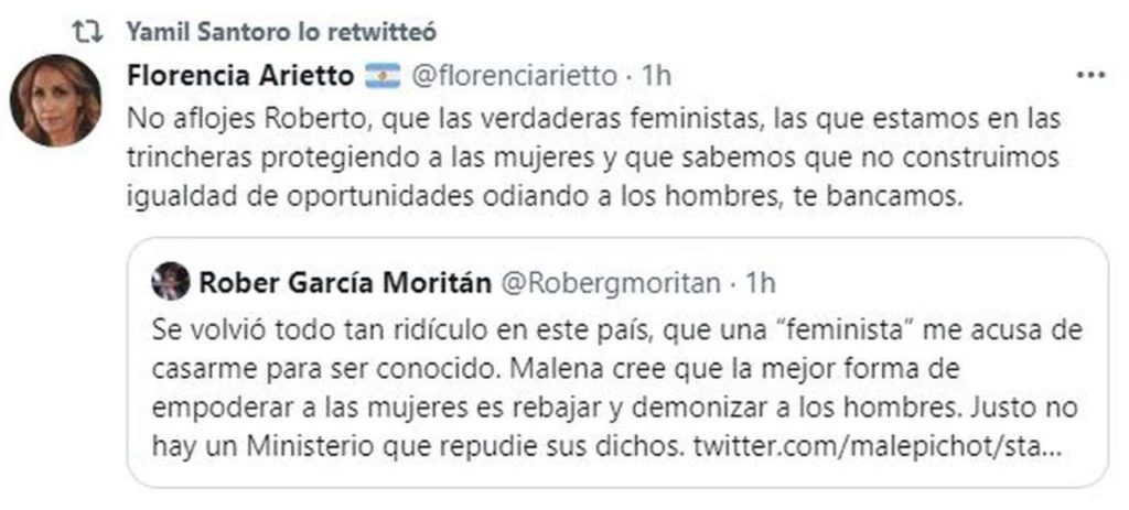 Florencia Arietto también expresó su apoyo a Moritán en las redes: “No aflojes Roberto, que las verdaderas feministas, las que estamos en las trincheras protegiendo a las mujeres y que sabemos que no construimos igualdad de oportunidades odiando a los hombres, te bancamos”, escribió.
