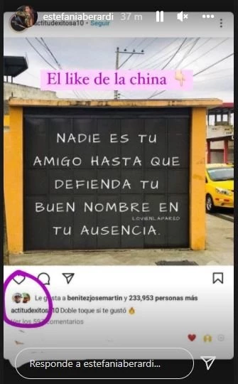 Fue Estefi Berardi la detective que encontró el tremendo like y lo compartió en sus stories de Instagram. “Nadie es tu amigo hasta que defienda tu buen nombre en tu ausencia”, reza una foto a la que María Eugenia le dio su polémico me gusta.