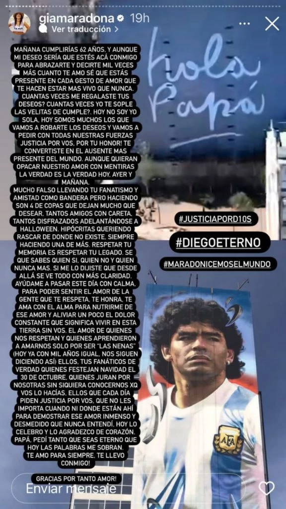 Para cerrar el mensaje, que estaba acompañado de una foto de Diego Armando mientras jugaba con la Selección Argentina, Gianinna dijo: “Hoy lo celebro y agradezco de corazón papá. Pedí tanto que seas eterno que hoy las palabras me sobran. Te amo para siempre, te llevo conmigo. Gracias por tanto amor”.