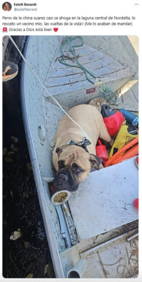 El hecho no tardó en hacerse noticia y rápidamente tomó revuelo. “El perro de la China Suárez casi se ahoga en la laguna central de Nordelta, lo rescató un vecino mío”, escribió una panelista de Los Profesionales de Siempre, junto a una imagen de la mascota de la China arriba de una pequeña embarcación.