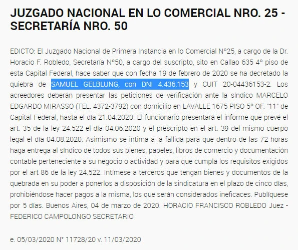 "El Juzgado Nacional de Primera Instancia en lo Comercial Nº25, a cargo de la Dr. Horacio F.Robledo, Secretaría Nº50, a cargo del suscripto, sito en Callao 635 4º piso de esta Capital Federal, hace saber que con fecha 19 de febrero de 2020 se ha decretado la quiebra de Samuel Gelblung", indica el documento.