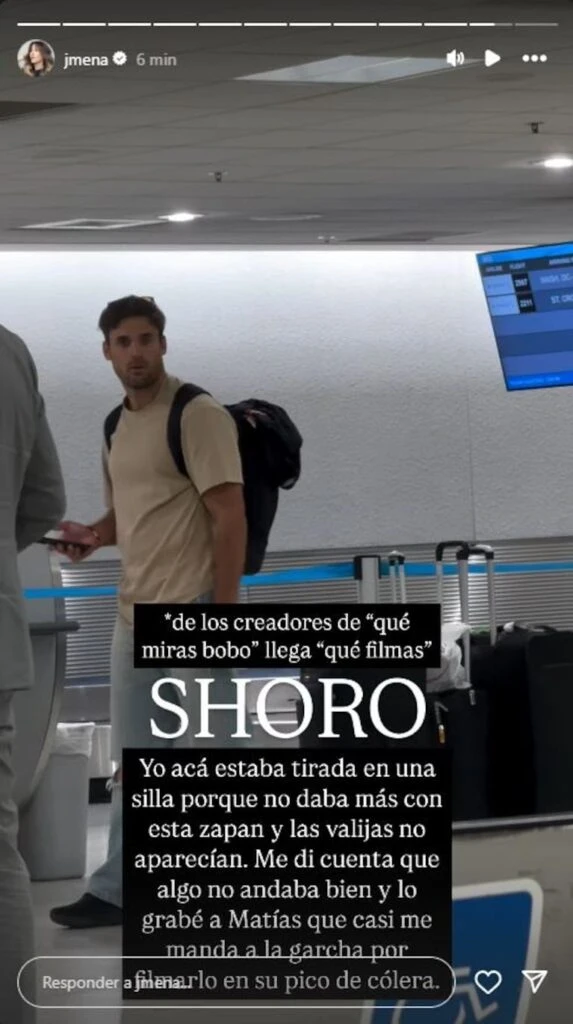 A su vez, la actriz explicó lo que pasó con su pareja: “Shoro. Yo acá estaba tirada en una silla porque no daba más con esta zapan y las valijas no aparecían. Me di cuenta de que algo no andaba bien y lo grabé a Matías que casi me manda a la gar... por filmarlo en un pico de cólera”.