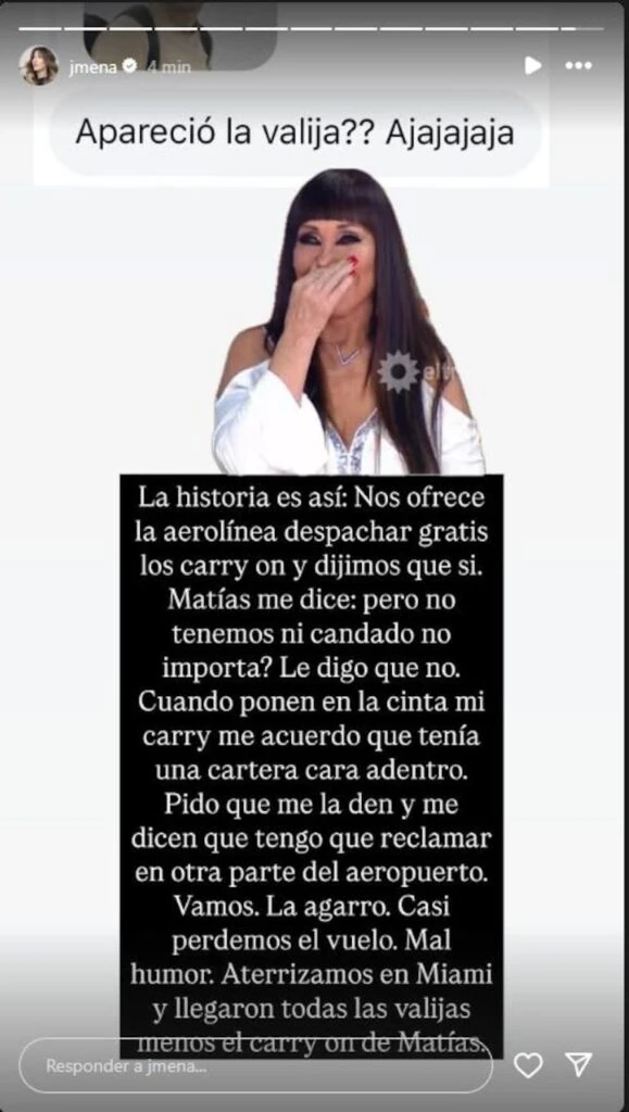 Luego de que las aguas se calmaran, Jimena Barón se expresó en su Instagram y contó qué fue lo que ocurrió: “La historia es así: la aerolínea nos ofreció despachar gratis los carry on y dijimos que sí. Matías me dijo ‘pero no tenemos ni candado, ¿no importa?‘. Le dije que no".