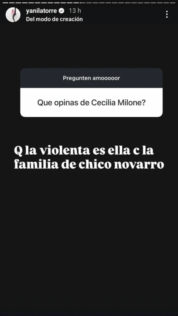 En este contexto, Yanina Latorre aprovechó su cuenta de Instagram para abrir su cajita de preguntas y responder sobre diversos temas, incluyendo la actitud de Milone. La panelista fue contundente: “Que la violenta es ella con la familia de Chico Novarro”.