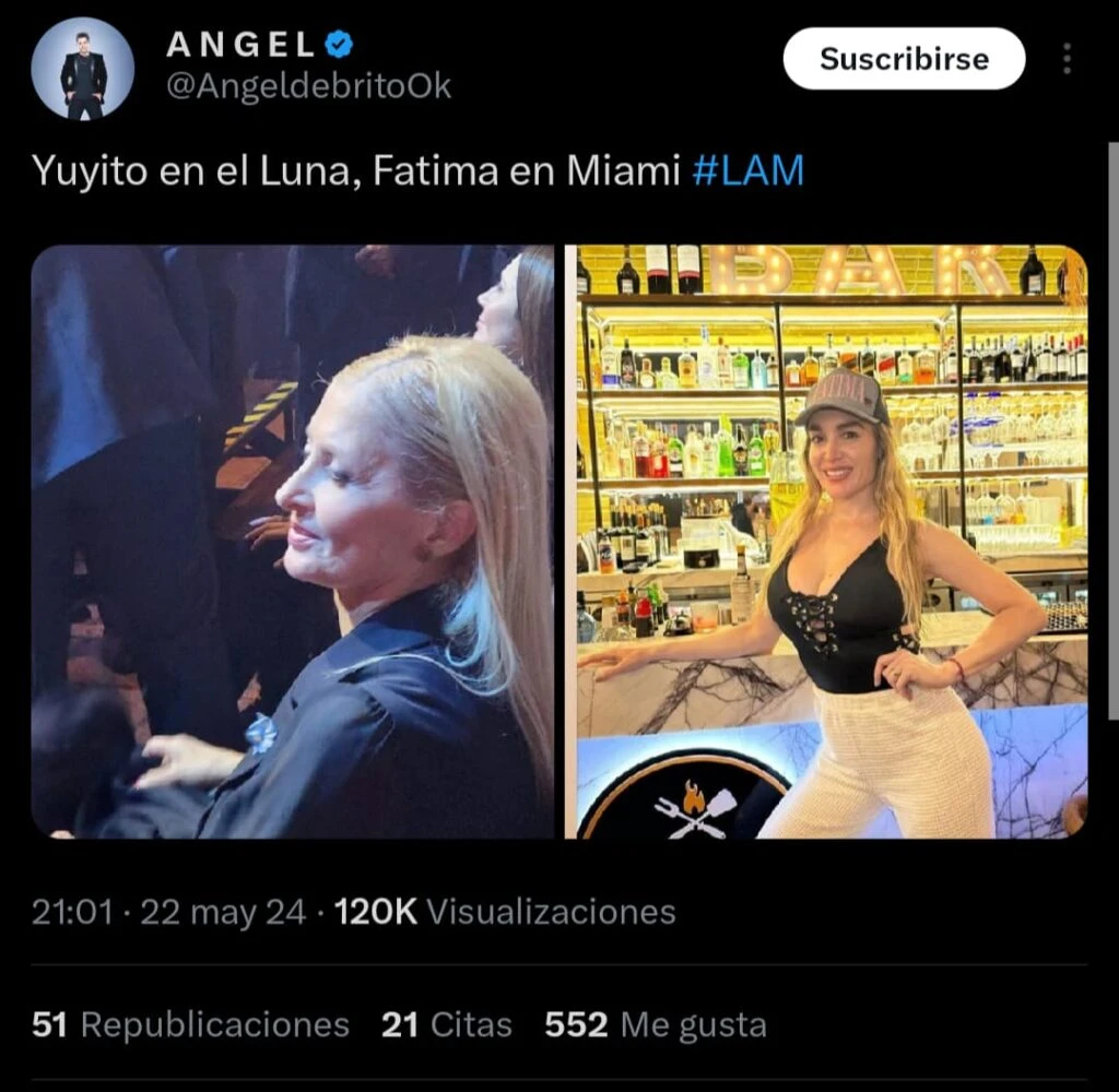 En su cuenta de Twitter, el periodista subió dos fotos, una de la conductora sentada en primera fila y otra de Fátima Flórez en Miami, Estados Unidos. Esto no fue todo, ya que a las imágenes las acompañó el texto "Yuyito en el Luna, Fátima en Miami".