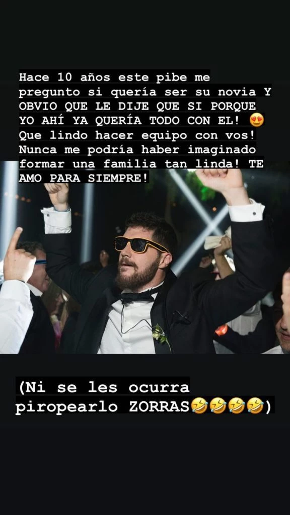 Y sorprendió con una advertencia: "Hace 10 años, este pibe me preguntó si quería ser su novia y OBVIO QUE LE DIJE QUE SÍ PORQUE YO AHÍ YA QUERÍA TODO CON ÉL. Qué lindo hacer equipo con vos. Nunca podría haber imaginado formar una familia tan linda. Te amo para siempre. Ni se les ocurra piropearlo, ZORRAS".