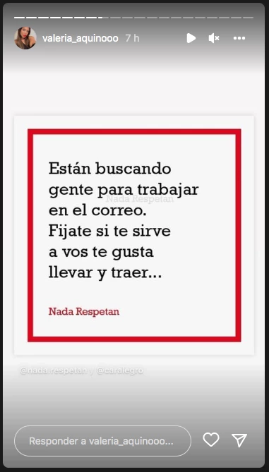 Valeria posteó una imagen con una frase muy filosa, que se puede interpretar como un palo contra Barby. “Están buscando gente para trabajar en el correo. Fijate si te sirve, que a vos te gusta llevar y traer...”, publicó la bailarina en su perfil digital.