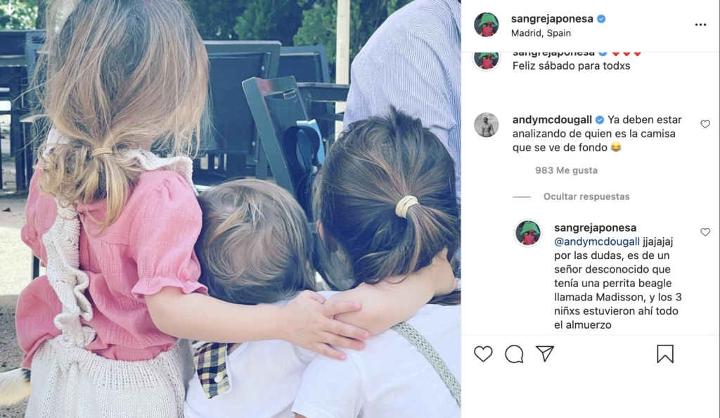 “Ya deben estar analizando de quién es la camisa que se ve de fondo”, bromeó el internauta. Asimismo, Eugenia decidió responder y con humor y picardía explicó quién era aquella persona y qué rol cumplió en la imagen: “Jajaja. Por las dudas, es de un señor desconocido que tenía una perrita beagle llamada Madisson, y los 3 niñxs estuvieron ahí todo el almuerzo”.