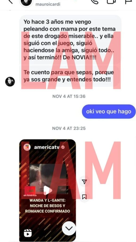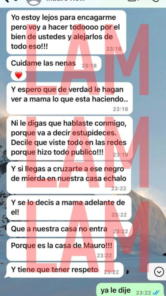 “¿No le dijiste que lo viste en todos los medios? Qué es un asco y una vergüenza. Mirá lo que te mando en Instagram. Vos tenés que decir de todo, que vos y tus hermanos no lo aceptan esto. Qué es un asco, una vergüenza, que se quieren venir conmigo. Ahí ella se va a asustar y lo va a mandar a la mier... (por L-Gante)", decía Mauro.