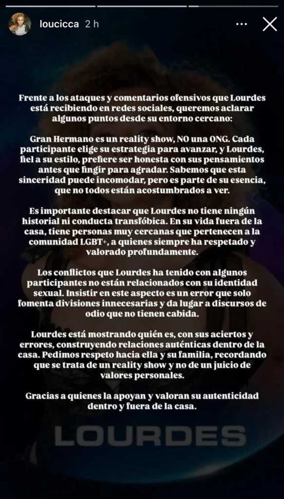 “Frente a los ataques y comentarios ofensivos que Lourdes está recibiendo en redes sociales, queremos aclarar algunos puntos desde su entorno cercano”, empezó el mensaje. “Gran Hermano es un reality show, no una ONG. Cada participante elige su estrategia para avanzar y Lourdes, fiel a su estilo, prefiere ser honesta con sus pensamientos antes que fingir para agradar”, explicaron.