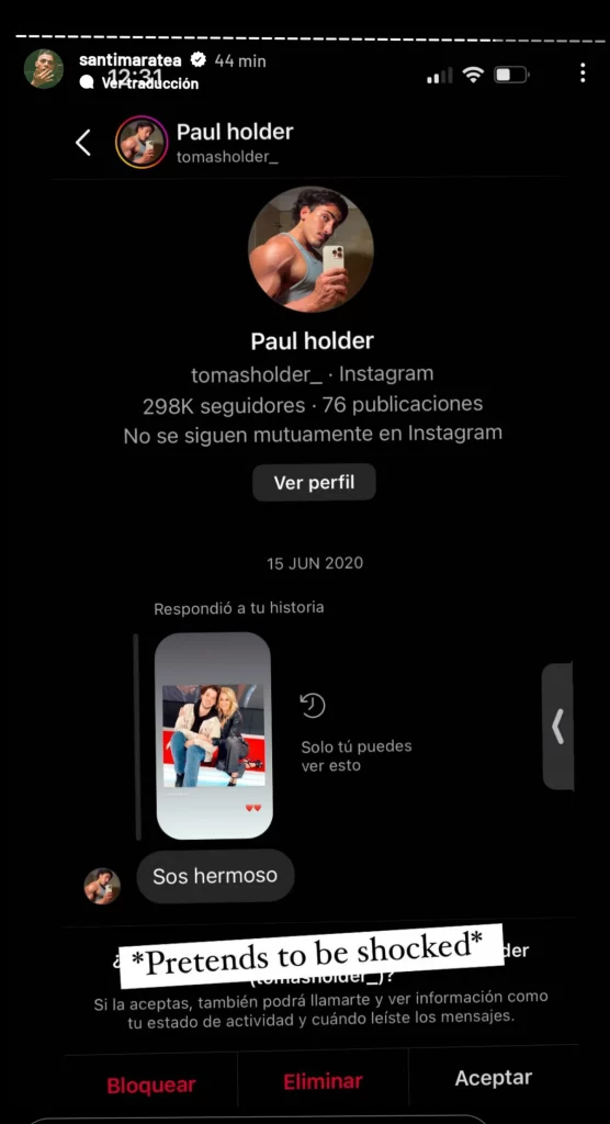 Como lo prometido es deuda, Santiago mostró el mensaje que le mandó Holder dos años atrás aproximadamente, en donde le confesaba sus sentimientos: "Sos hermoso". Acto seguido Maratea escribió junto a la imagen: "Pretends to be shocked (pretender estar shockeado/sorprendido)".
