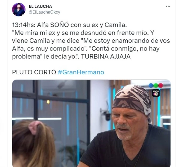 Ahora bien, cuando nada puede estar peor, Alfa le contó a Romina un polémico sueño que tuvo con Camila y su ex pareja: "Me mira mi ex y se me desnudó en frente mío. Y viene Camila y me dice 'me estoy enamorando de vos Alfa, es muy complicado'. 'Contá conmigo, no hay problema' le decía yo".