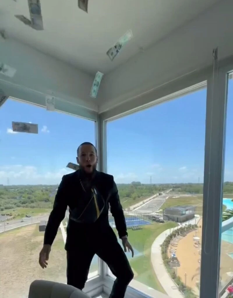 “Mira donde estoy, en mi pinche penhouse. Ladies and gentlemen. 368.000 mil dólares. Gente, acá estamos masivos bro. Acá estamos en otro nivel porque hay quien tiene plata y que hace lo que quiere”, continuó El Enperador al tiempo que re boleaba billetes por el aire y lo acompañaba una hermosa vista al río.