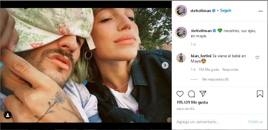 Desde que Ricky Montaner cumplió sus 30 años su pareja, Stefi Roitman, no hace más que publicar imágenes y frases que alimentan los rumores de un posible embarazo. Hace algunas horas, la actriz subió una foto de ambos con la leyenda: “Nosotros, sus ojos, en mayo”.