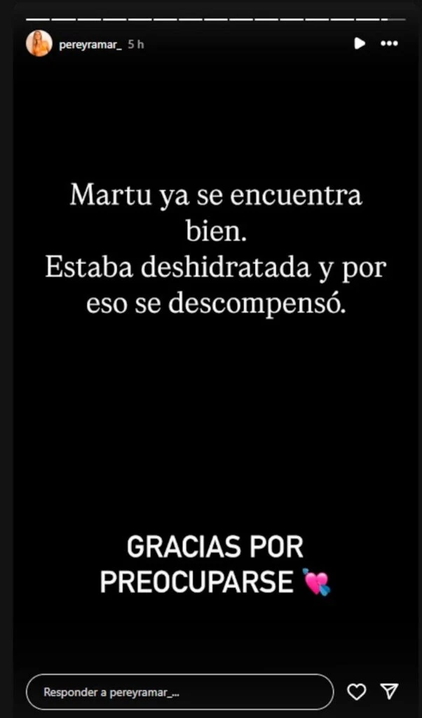 Tras haberse repetido un episodio de similares características y ante el silencio del reality, su familia decidió emitir un comunicado para contar su verdad. A través de las redes sociales de la participante platense, aclararon qué fue lo sucedido: “Martu ya se encuentra bien. Estaba deshidratada y por eso se descompensó. Gracias por preocuparse”, escribieron en una historia de Instagram.