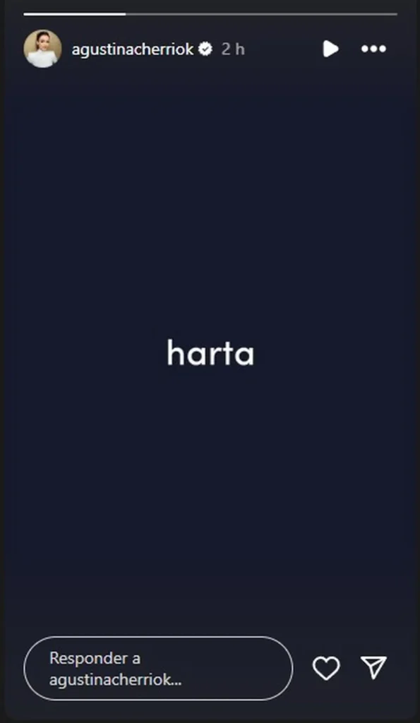 Todo se dio cuando Agustina Cherri decidió compartir mediante su cuenta de Instagram una historia donde se ve un fondo gris y una sola palabra en medio de la pantalla. La actriz que comenzó su carrera de la mano de Cris Morena, escribió: "Harta".