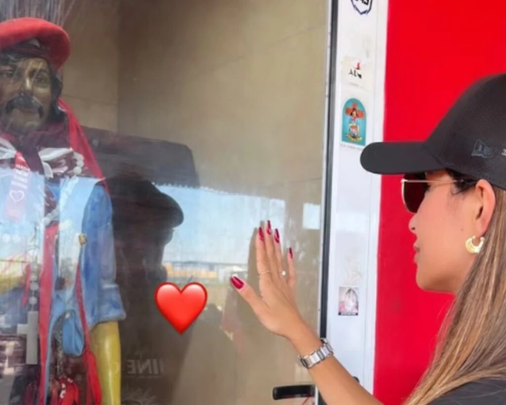 Aferrada a la fe, Lourdes Sánchez frenó su marcha camino a su localidad natal, en la provincia de Corrientes. La bailarina se detuvo por unos minutos en la localidad de Mercedes en donde se encuentra el santuario original del Gauchito Gil, figura religiosa, objeto de devoción popular.
