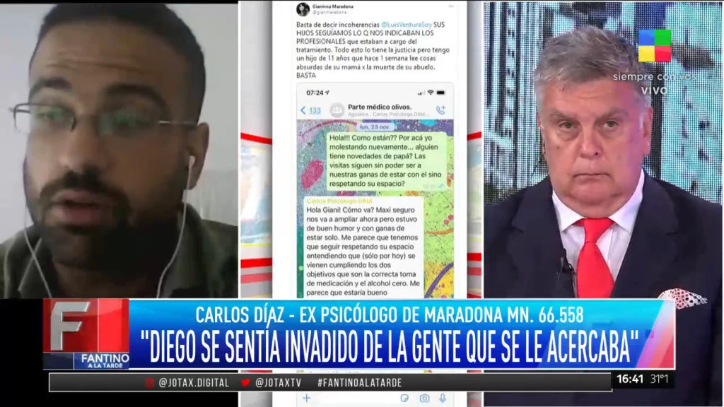 Por su parte, Díaz explicó que cuando “una persona deja de consumir sustancias es natural que aparezcan episodios de irritabilidad y de dificultad para vincularse”, por lo que Maradona se sintió invadido ante la presencia de varios allegados y creyó que había “hipocresía en algunas personas” que lo fueron a ver únicamente en su momento de vulnerabilidad.