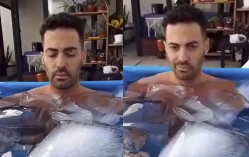 Las imágenes son realmente impactantes: muestran a Caiazza con el 90 por ciento de su cuerpo sumergido en esa pileta convertida en "freezer, "cámara frigorífica" o "congeladora" sin siquiera mosquearse.
