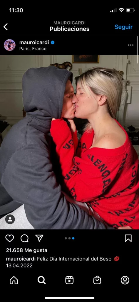 "Feliz Día Internacional del Beso", expresó el futbolista junto a tres fotos cariñosas con Wanda, besándola en su casa; muy románticos y compinches a pesar de los rumores.